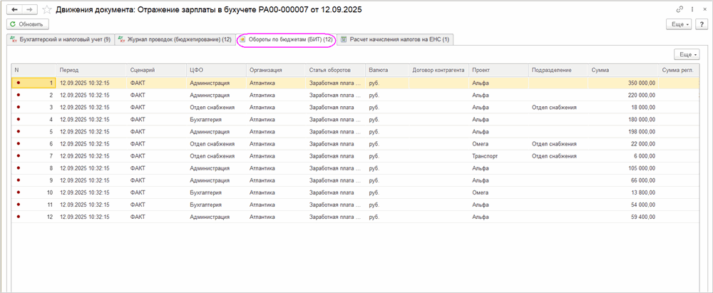 При проведении документов по начислению заработной платы система формирует факт по ФОТ в бюджете и дает возможность разнести суммы ФОТ, страховых взносов, НДФЛ и удержаний по ЦФО, проектам и другим аналитикам. Такое распределение обеспечивает точный план‑фактный анализ затрат на персонал в разрезе подразделений и направлений деятельности.