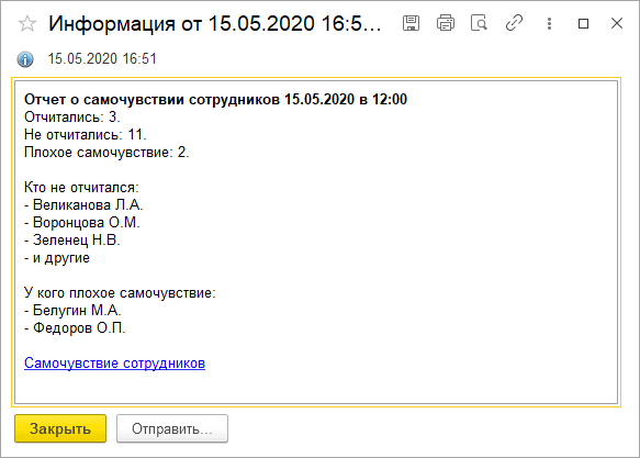 Кликнув на Контроль самочувствия сотрудников в подразделе Совместная Работа, ответственный сотрудник может увидеть аналогичные отчеты.